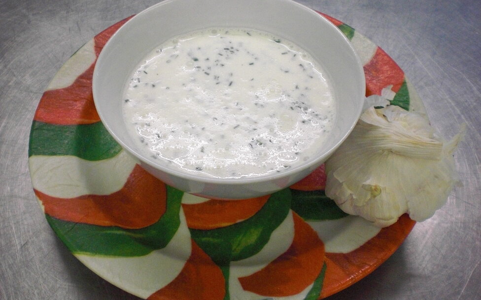 Die Zwiebel fein hacken, den Knoblauch pressen und mit der Creme Fraiche mischen. Anschließend die Kräuter fein hacken und ebenfalls unter Quark und Creme Fraiche geben. Mit Pfeffer, Salz und Kräuteressig vorsichtig abschmecken – gerade mit dem Essig ist sensibel umzugehen!