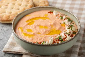 - Zerdrücke den Schafskäse mit einer Gabel. Rühre ihn mit Joghurt und Olivenöl glatt.